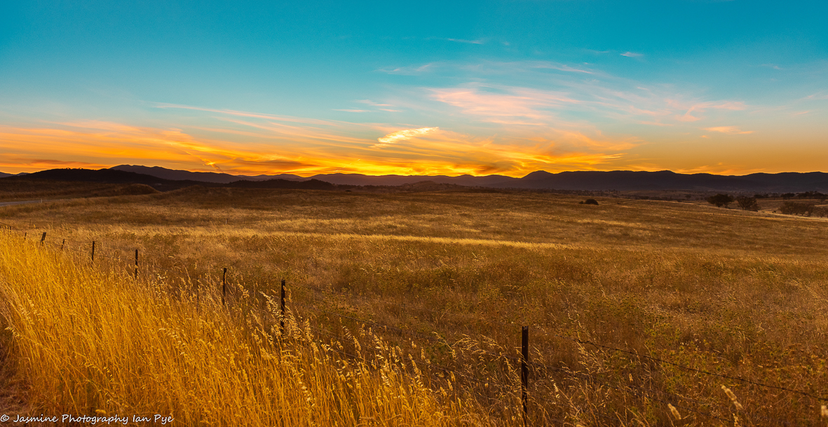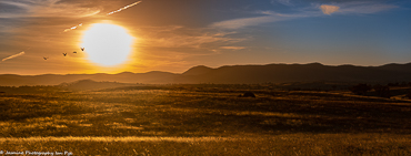 As I passed Coppins Crossing many times in the summer, I was struck by the intense and beautiful sunsets over the Brindabella Mountains. Finally, I committed to spending time at the top of the hill near Coppins Crossing in the late afternoon, waiting for the sun to set over the mountains. I wasn't disappointed. This is what I saw. Colours changing rapidly and clouds offering mysterious shapes and suggestive patterns. I took a shot with the sun about to set and a jet stream overhead. I didnt notice until after the shot that four birds photo-bombed the shot in just the perfect position against the sun. In another scene is a crimson Pterodactyl flying overhead. But the real capture for me is the calm evening and warm light over the rolling foothills of the Brindabellas.